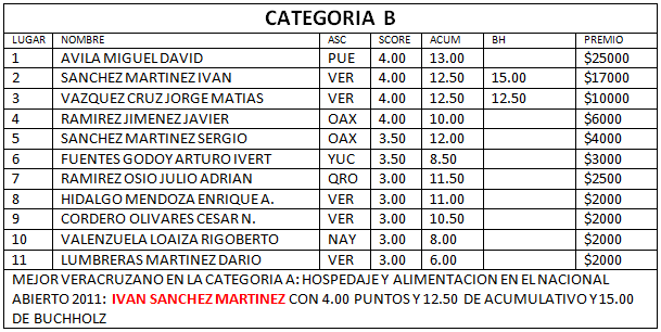 El ganadora del Torneo será designado “Campeón Estatal Femenil 2011” por parte de la Asociación Estatal de Ajedrez José Ma. Morelos.